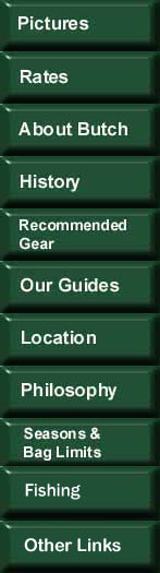 Pictures Rates About Butch Waggoner History Recommended Gear for Hunting Information about our guides Seasons and Bag Limits Butch\'s Philosophy Location Information Fishing Other Links